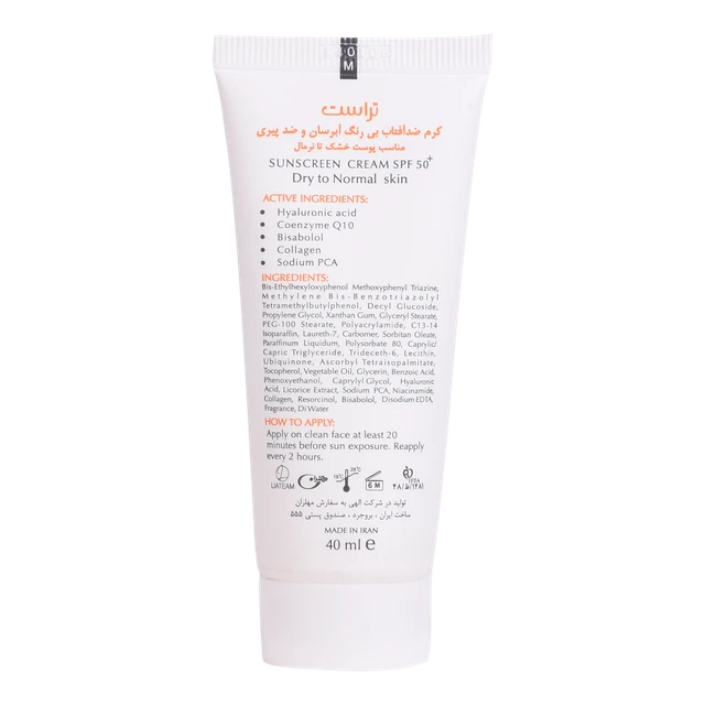 ویژگی : محافظت از پوست در برابر اشعه های مضر خورشید دارای اثر محافظتی پوست در برابر اشعه UVA , UVB و IR محافظت در برابر آلودگی های محیطی مناسب آقایان و خانم ها دارای اثر مرطوب کنندگی و ضدپیری فاقد پارابن